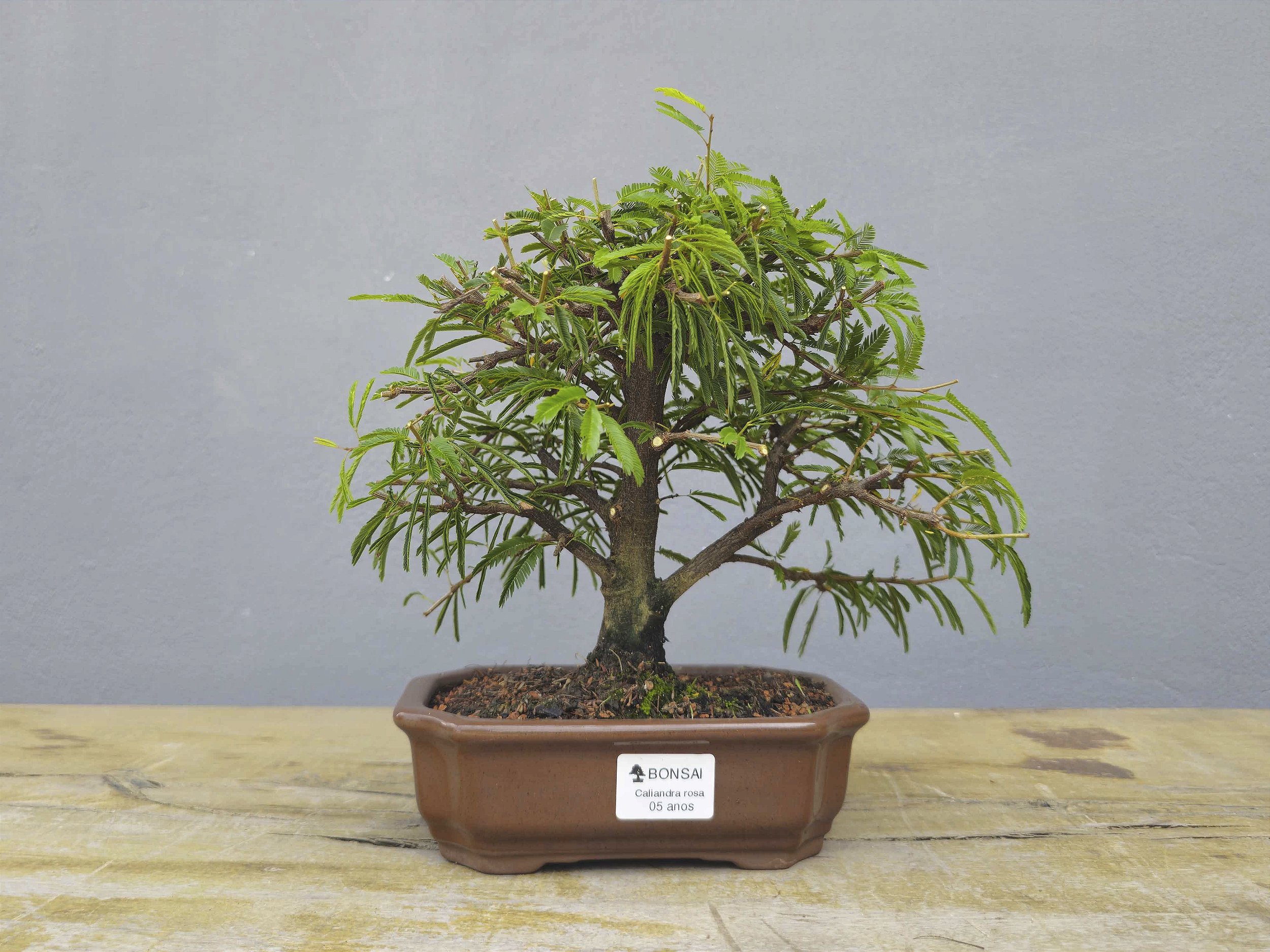 Caliandra Selloi: Planta charmosa, ideal para pratica do bonsai, possui folhas pequenas bipinadas, que se fecham durante a noite, dona de uma flor exuberante em forma de pompom, tronco de coloração acinzentado.