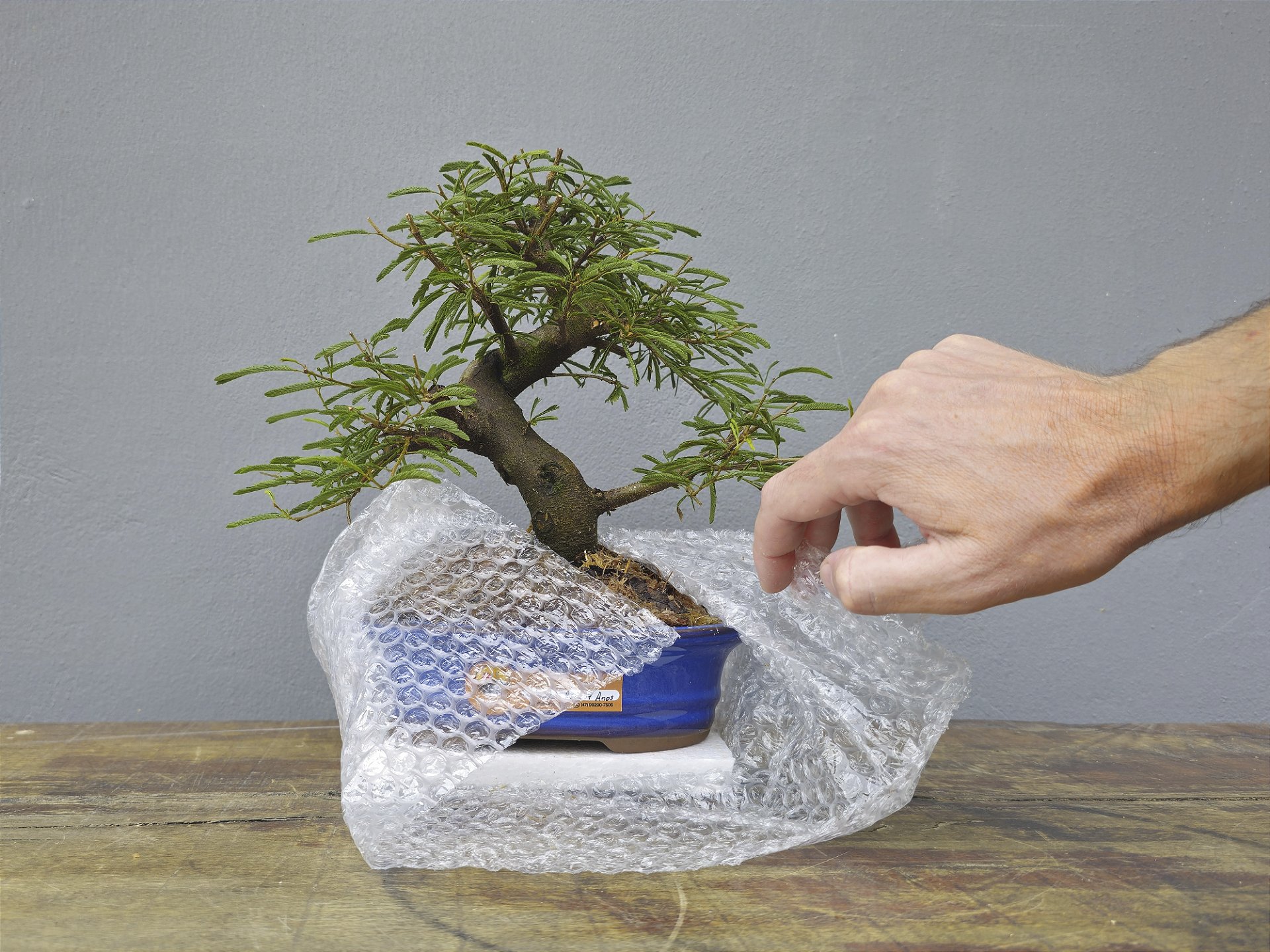 Remova o Bonsai com cuidado de dentro da armação de madeira cortando os fitilhos, em seguida, retire o plástico bolha que envolve o vaso e o isopor anti-impacto.